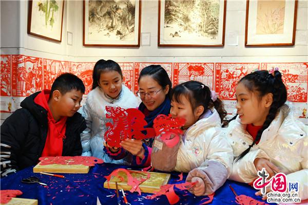 “?;⒆髌废盗卸际俏易约涸O(shè)計(jì)創(chuàng)作的,一共18款,每款的造型都不一樣。”1月26日,在位于湖南省新邵縣嚴(yán)塘鎮(zhèn)大源村的非遺剪紙展覽館,邵陽剪紙非遺傳承人馬麗婭帶著幾名萌娃學(xué)習(xí)剪紙,為即將到來的虎年春節(jié)增添一抹喜慶。