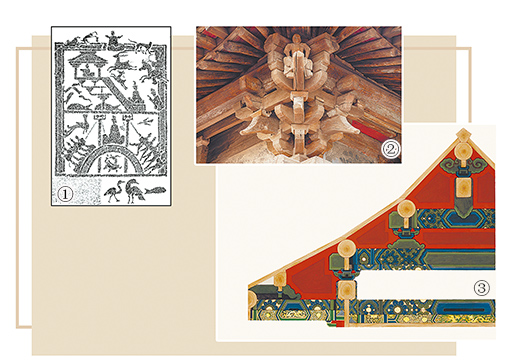 圖①:漢代畫像磚(石)上的高架建筑。 圖②:山西雙林寺大殿斗拱。 圖③:故宮建筑上的旋子彩畫小樣。