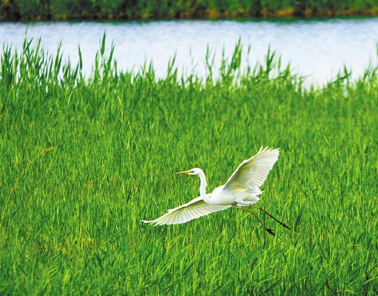 初夏的甘肅張掖國家濕地公園蘆葦青青,幾只白鷺在綠色的蘆葦中時(shí)而嬉戲飛翔,時(shí)而駐足覓食,成為濕地一道美麗風(fēng)景。 人民網(wǎng)照片