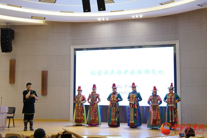 談及服飾,裕固族歌手索恩吉斯現(xiàn)場還原了裕固族女孩出嫁時的場景,演唱了歌曲《戴頭面歌》,展示了國家非物質文化遺產(chǎn)項目的獨特魅力。