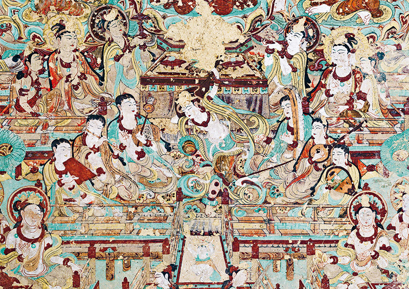 敦煌文化延續(xù)近兩千年,是世界現(xiàn)存規(guī)模最大、延續(xù)時(shí)間最長、內(nèi)容最豐富、保存最完整的藝術(shù)寶庫,是世界文明長河中的一顆璀璨明珠,也是研究我國古代各民族政治、經(jīng)濟(jì)、軍事、文化、藝術(shù)的珍貴史料。圖為莫高窟第112窟南壁壁畫“反彈琵琶樂舞圖”?!《鼗脱芯吭汗﹫D
