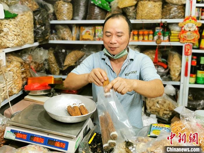資料圖為廣東臺山富城市場內,一藥材檔的老板為顧客用密實袋打包參絲。 中新社發(fā) 李曉春 攝