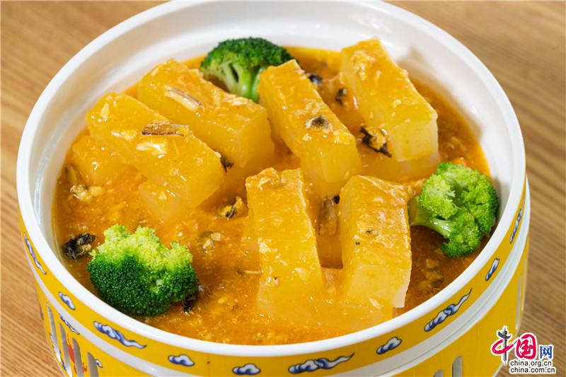 肉質(zhì)緊密的成熟冬瓜以高湯煨過(guò),有股翡翠的溫潤(rùn)通透。以新鮮金燦的蟹黃粉掛芡調(diào)味,入口即化,在齒頰間迸出幽幽的鮮味,醇厚的口感又不乏清新爽口的層次。
