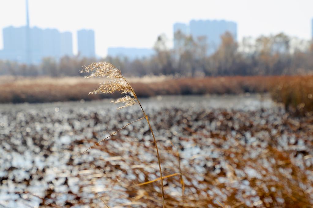 立冬時節(jié),登上哈爾濱松浦大橋,在下橋口順臺階而下,映入眼簾的是大片金黃色的蘆葦蕩,白色蘆花點(diǎn)綴其中迎風(fēng)招展,透過澄澈的水面依稀可見水草和水藻。在位于哈爾濱市松花江北面的阿勒錦島國家濕地公園,不少市民來這里徒步、騎行、健身,公園每年接待游客量超40萬人次。
