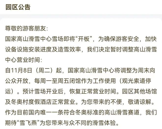 根據(jù)公告,自11月8日(周二)起,國家高山滑雪中心將調(diào)整為周末向公眾開放,每周一至周五閉館作為工作使用(觀光索道停運)。預(yù)計雪場開業(yè)后,恢復(fù)正常營業(yè)時間。目前,“雪飛燕”已對外開放,如果纜車開放,便可以乘坐纜車上到山頂。