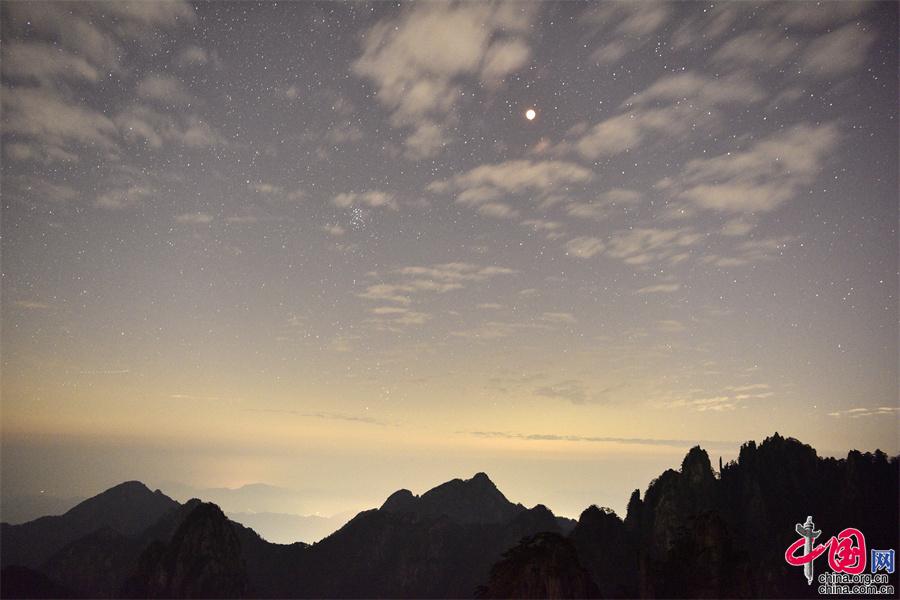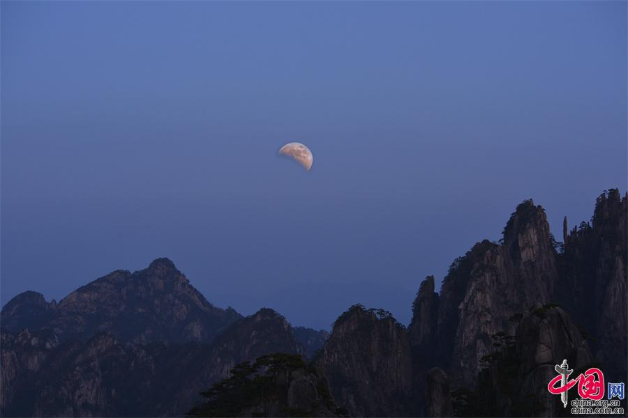 2022年11月8日晚,黃山之巔的群峰上出現(xiàn)的月全食景觀,給美麗的黃山增添一道美輪美奐的風(fēng)景。