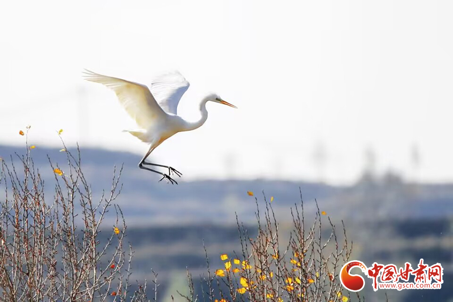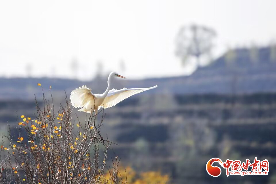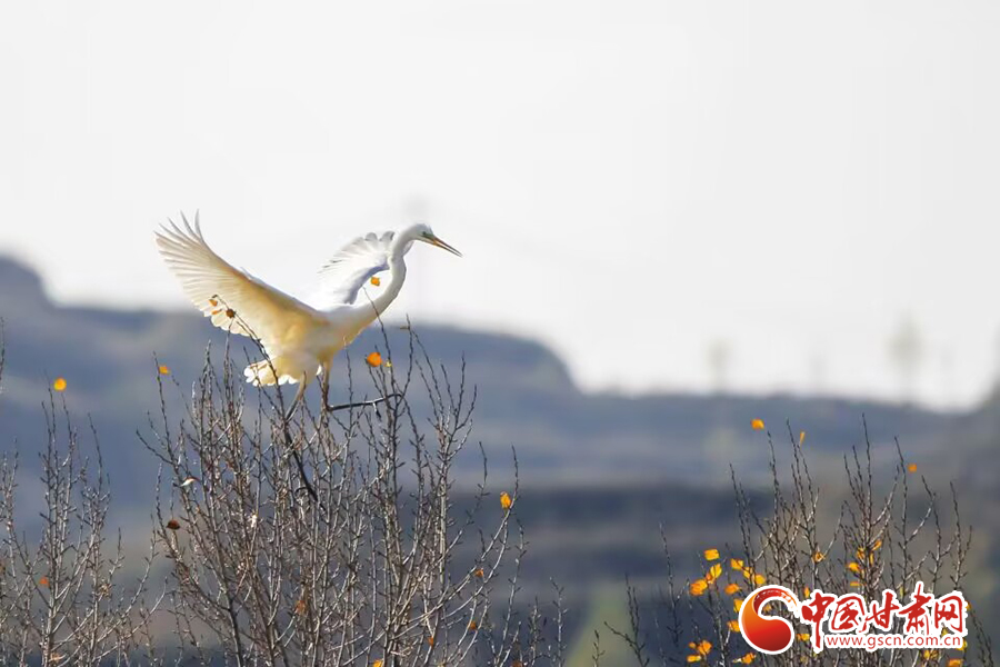 初冬時節(jié),在平?jīng)鍪谐缧趴h于家灣鷺鳥紛飛,繪就一幅人與自然和諧共生的美麗畫面。