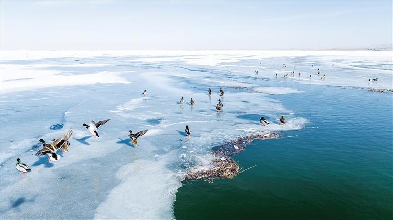 中國甘肅網(wǎng)2月3日訊 據(jù)蘭州晚報(bào)報(bào)道(通訊員 李永華 魏生明 記者 高慧霞 攝)2月2日,位于金塔縣的解放村水庫,越冬候鳥綠頭鴨、赤麻鴨成群結(jié)隊(duì)。隨著金塔縣生態(tài)環(huán)境的持續(xù)改善和好轉(zhuǎn),近幾年過境候鳥數(shù)量持續(xù)升高,每年冬天都有綠頭鴨、赤麻鴨等鳥類遷徙到解放村水庫等濕地越冬。