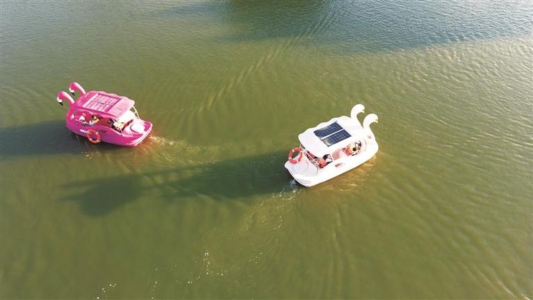 雁灘公園游客乘坐天鵝船戲水