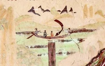 同樣是水上活動(dòng)的操舟,在敦煌壁畫中也有多種表現(xiàn)。無(wú)論是舟的形制,還是操舟者的運(yùn)行方式,都極為形象地展現(xiàn)在壁畫中。在時(shí)代為北周的莫高窟296窟中,有一艘正在水中航行,船體較短的獨(dú)木舟,尖頭尖尾,中間大、兩頭小。獨(dú)木舟中間乘坐三人,船頭船尾各有一名赤膊強(qiáng)健的水手在搖櫓與撐篙。這一畫面體現(xiàn)了人們于水中蕩舟的活動(dòng)場(chǎng)景。而在時(shí)代為初唐的莫高窟323窟中,壁畫中展現(xiàn)的操舟形象卻是另一番場(chǎng)景,畫面中的船雖然仍是一葉扁舟,但舟身上部設(shè)置了風(fēng)帆,用于劃船的櫓也很清晰,類似今天的搖櫓帆船。舟行水中,風(fēng)帆鼓浪,前有一人撐槳,整體呈現(xiàn)出一幅“風(fēng)帆欲起橫江上,水影遙看海上天”的運(yùn)動(dòng)場(chǎng)景(圖①)。
