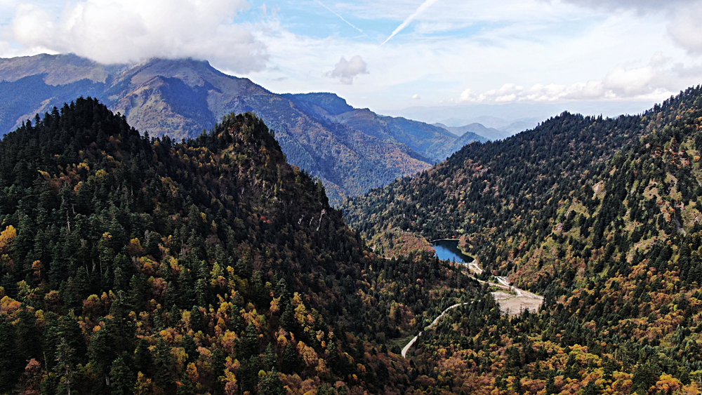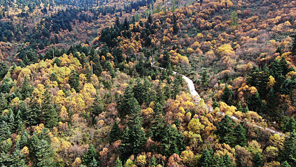 金秋時節(jié),甘肅省隴南市宕昌縣官鵝溝森林公園層林盡染,斑斕如畫,吸引了不少游客前來游玩。新華網(wǎng)發(fā)(劉輝 攝)