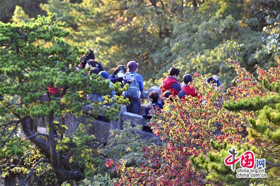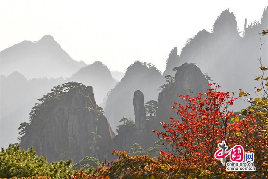 秋日黃山,雨后放晴最為嫵媚。蔚藍(lán)色的天空一塵不染,山間綿連不斷的云海,時(shí)而像海浪在空中翻滾,擁擠著、碰撞著,時(shí)而像一匹白紗綢緞,環(huán)繞在山巔上、飄散在松林間,只見(jiàn)黃山的紅葉點(diǎn)點(diǎn)散落,紅綠相間,與峻峭山峰、藍(lán)天云海、奇松怪石,精致婉約地繪成一幅幅五顏六色的山林畫卷,正是登游好時(shí)節(jié)。(姚育青)