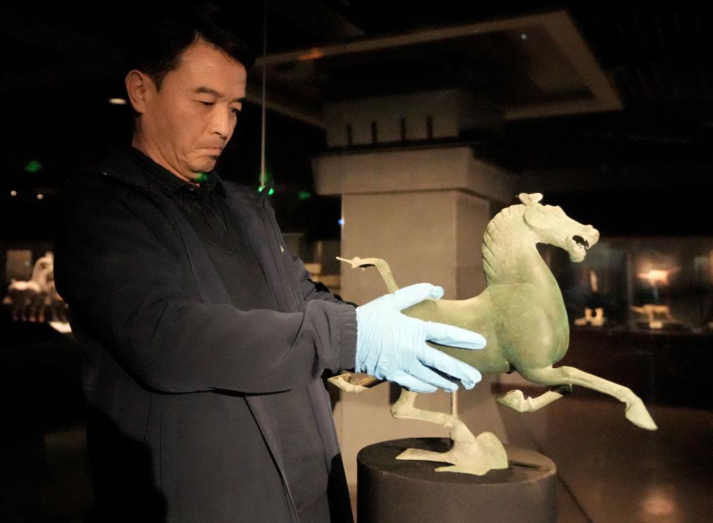 工作人員在甘肅省博物館展廳內(nèi)安放銅奔馬(2023年10月27日攝)。新華社記者 王毓國 攝