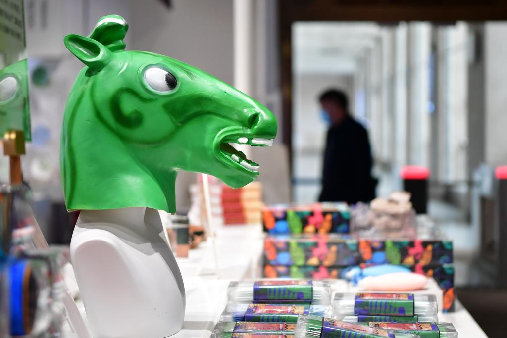 在甘肅省博物館文創(chuàng)商店拍攝的以銅奔馬為主題設(shè)計(jì)的“綠馬頭套”(2022年5月13日攝)。新華社記者 陳斌 攝