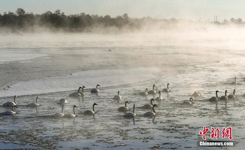 1月21日清晨,甘肅張掖市黑河國家級自然保護(hù)區(qū),受低溫影響,黑河水面霧氣氤氳縹緲,天鵝在水中暢游,野鴨等候鳥在空中飛舞,宛如一幅水墨生態(tài)畫卷。圖/CNSphoto 成 林 攝