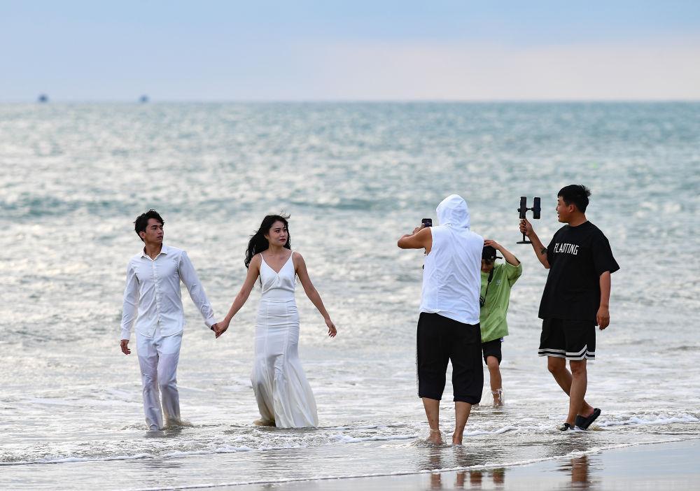↑2023年12月19日,一對情侶在三亞“椰夢長廊”海濱風(fēng)景大道拍照留念,新華社記者 樊雨晴 攝