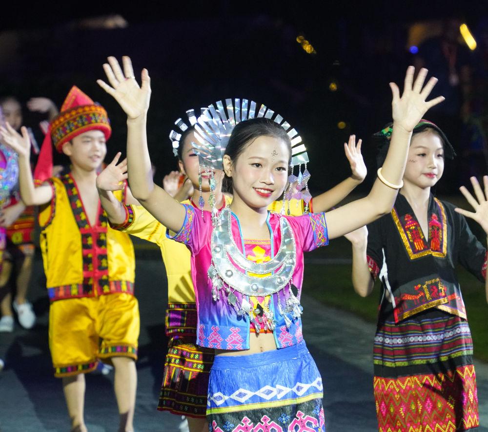 ↑2023年9月16日,海南省五指山市民族時(shí)裝“村秀”系列文化活動(dòng)開幕。鄉(xiāng)鎮(zhèn)居民身著黎族、苗族傳統(tǒng)和創(chuàng)新設(shè)計(jì)服飾,向人們展示民族傳統(tǒng)文化的魅力。圖為展示服裝的小朋友與觀眾互動(dòng)。新華社記者 樊雨晴 攝