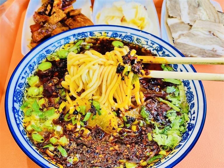 三月末的蘭州,天色尚未亮,蘭州城區(qū)千余家牛肉面館已開(kāi)門(mén)營(yíng)業(yè)。不少市民就來(lái)趕“頭鍋”,喚醒一天的精氣神。早上七八點(diǎn),面館的人越來(lái)越多,大家排著隊(duì),但并不需要等很久,稍等片刻牛肉面便出鍋了,熱氣騰騰,香氣四溢,吃起來(lái)更是回味無(wú)窮:面條筋道、湯汁濃郁。吃罷面,吹開(kāi)面湯上紅紅的辣椒油,喝一口湯,滿(mǎn)福滴很!