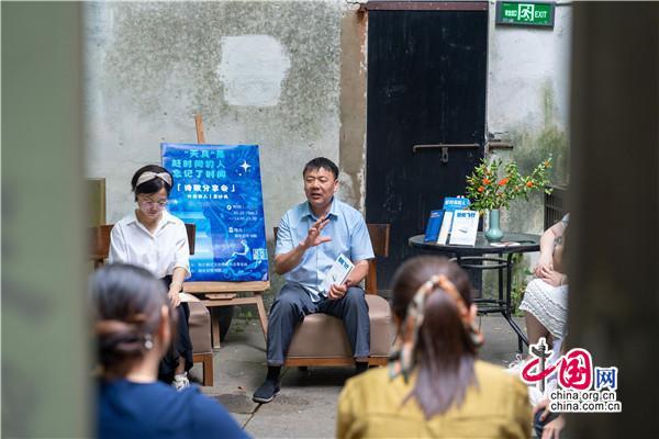 在書院小院里,一位腳穿布鞋,親切隨和,滿臉笑容的男士正在分享,從《趕時間的人》創(chuàng)作心得,到新書《低處飛行》作品朗誦和創(chuàng)作故事點(diǎn)滴,還有撿破爛、送外賣的人生經(jīng)歷,深情的講述,傳遞的是始終不曾改變的對寫詩的執(zhí)著與熱愛。