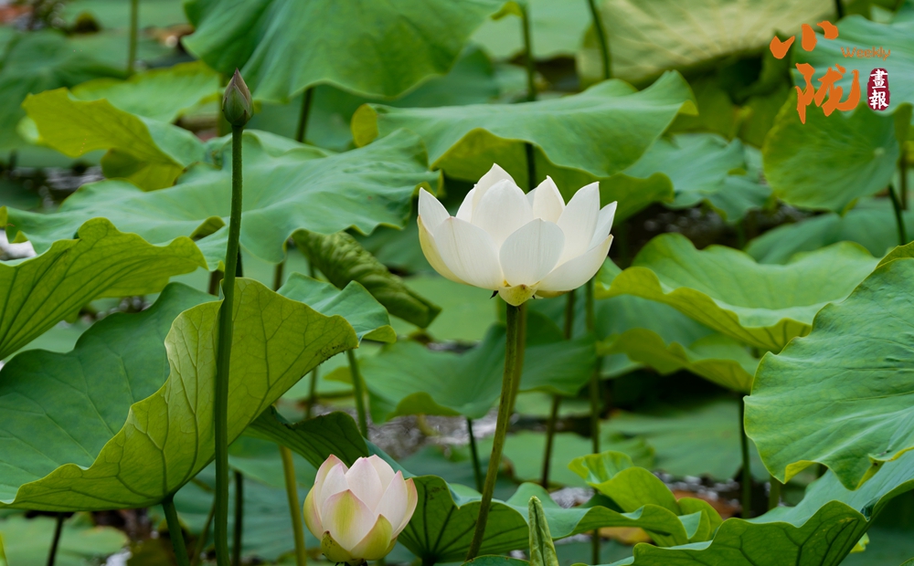 一朵朵、一簇簇、白色的荷花星星點點、清美動人點綴于成片的翠綠色荷葉間或肆意怒放,或含苞待放形成一幅美麗的生態(tài)畫卷。
