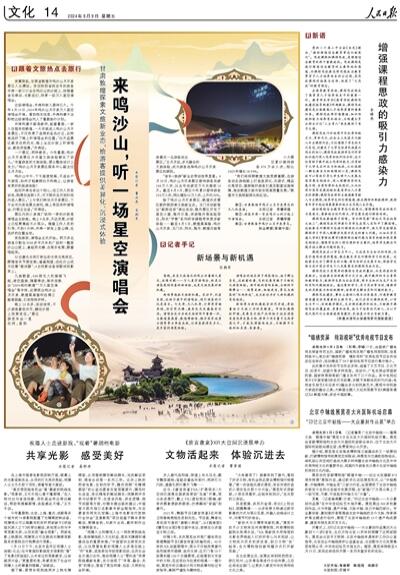 新場(chǎng)景造就文旅新機(jī)遇。采訪中,記者發(fā)現(xiàn),這場(chǎng)沙漠中的演唱會(huì),吸引游客的不僅是音樂(lè)。燈光秀、無(wú)人機(jī)秀、沙屏秀穿插亮相,炫彩熒光棒、鹿角發(fā)光發(fā)箍備受歡迎。演唱會(huì)成為當(dāng)?shù)匚穆镁仃囍兄匾画h(huán),與敦煌莫高窟、敦煌博物館、雅丹國(guó)家地質(zhì)公園等景點(diǎn)串連成線,讓游客獲得更多元、更豐富的游覽體驗(yàn)。