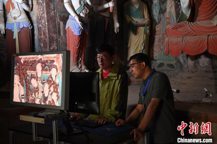 6月5日,敦煌莫高窟內(nèi),敦煌研究院文物數(shù)字化研究所工作人員進行敦煌壁畫數(shù)字化圖像現(xiàn)場檢查工作。中新社記者 李亞龍 攝