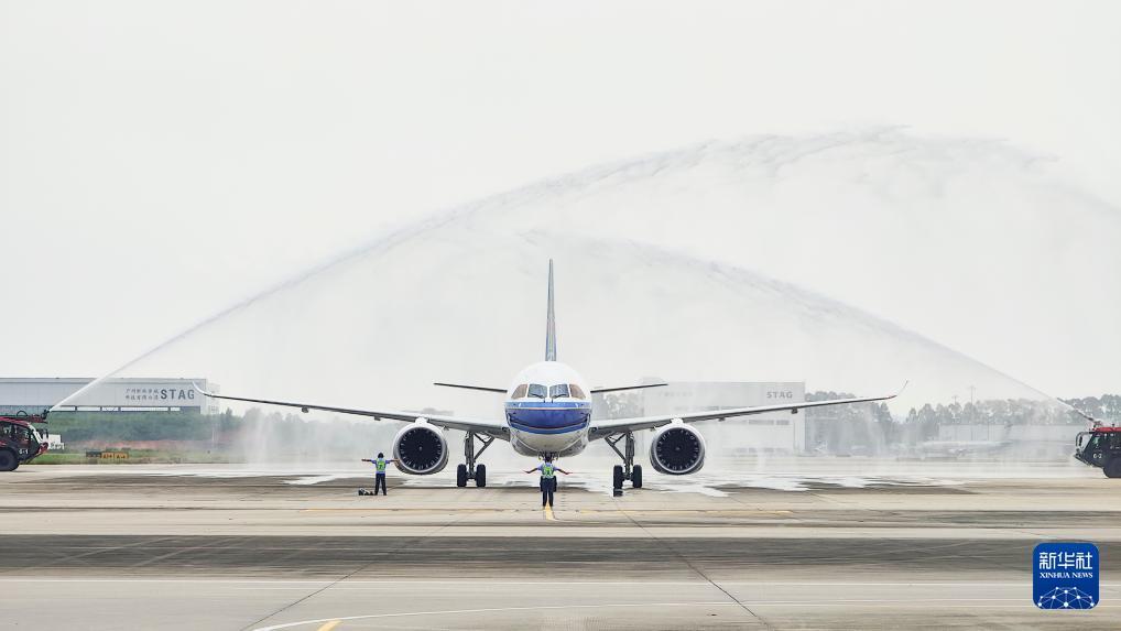 8月29日,南航首架C919國產(chǎn)大飛機在廣州白云國際機場緩緩穿過“水門”。新華社發(fā)