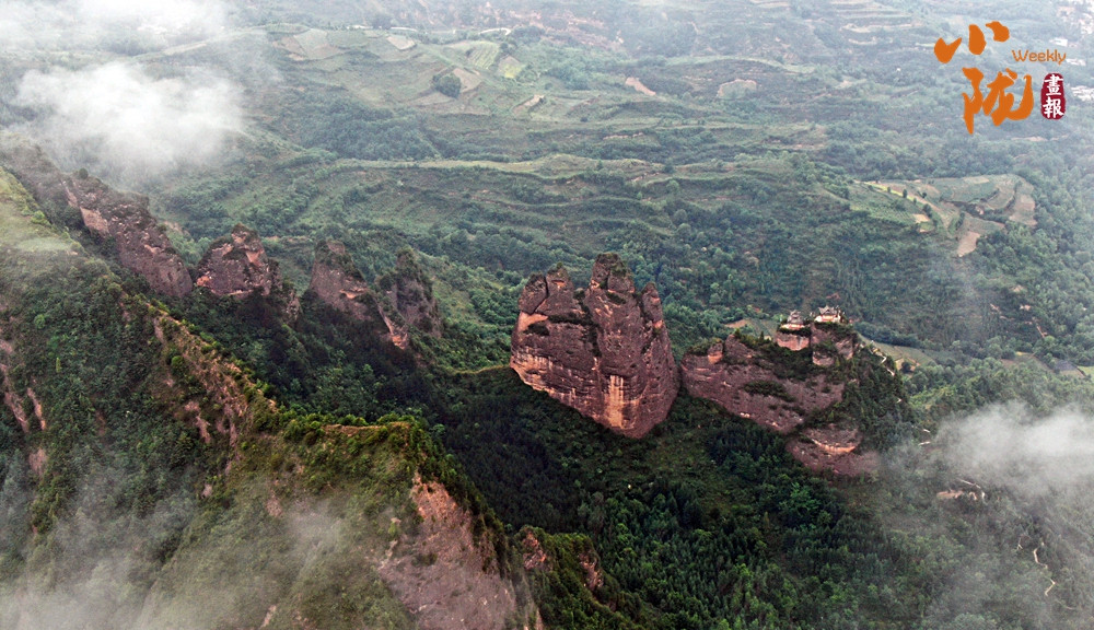 從空中俯瞰,牛頭山險(xiǎn)壑錯(cuò)綜,崖高十余丈,四面凌空,直立如削,呈現(xiàn)陽剛挺拔之勢。