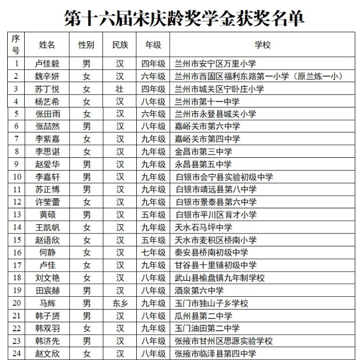 日前,經(jīng)地方各級(jí)教育行政部門推薦,第十六屆宋慶齡獎(jiǎng)學(xué)金獲獎(jiǎng)名單公布,全國共有1542名學(xué)生獲獎(jiǎng),其中甘肅56人。