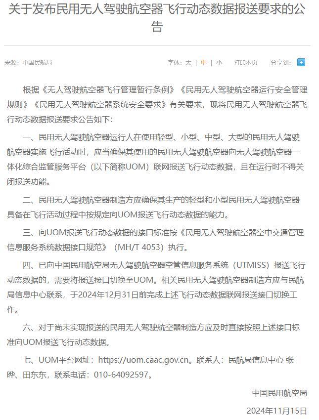 11月15日,民航局發(fā)布《關(guān)于發(fā)布民用無(wú)人駕駛航空器飛行動(dòng)態(tài)數(shù)據(jù)報(bào)送要求的公告》(以下簡(jiǎn)稱《公告》)。