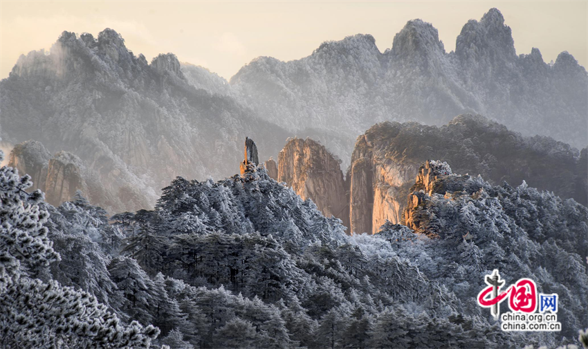 11月25日夜,安徽黃山風(fēng)景區(qū)迎來入冬首場降雪。26日,雪后初霽,五百里黃山銀裝素裹、分外妖嬈。山峰、奇松、怪石在朝陽的關(guān)愛下披上了一層金色的外衣。松林相間雪花層疊,熠熠生輝,翠色與銀白交織,宛如瓊枝玉樹,讓人流連忘返。