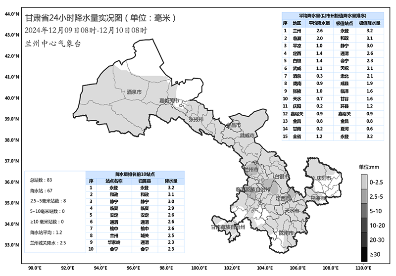 中國甘肅網(wǎng)12月10日訊(西北角·中國甘肅網(wǎng)記者 沈文剛)12月9日8時(shí)至12月10日8時(shí),全省共計(jì)67個(gè)縣區(qū)出現(xiàn)降雪,其中蘭州南部、臨夏南部、平?jīng)鑫鞑?、定西東部局部地方出現(xiàn)中雪。目前,較大累積降雪量出現(xiàn)在永登3.2mm、和政3.1mm、靜寧3.0mm、臨夏2.9mm、通渭2.6mm。蘭州本站降水2.5mm。