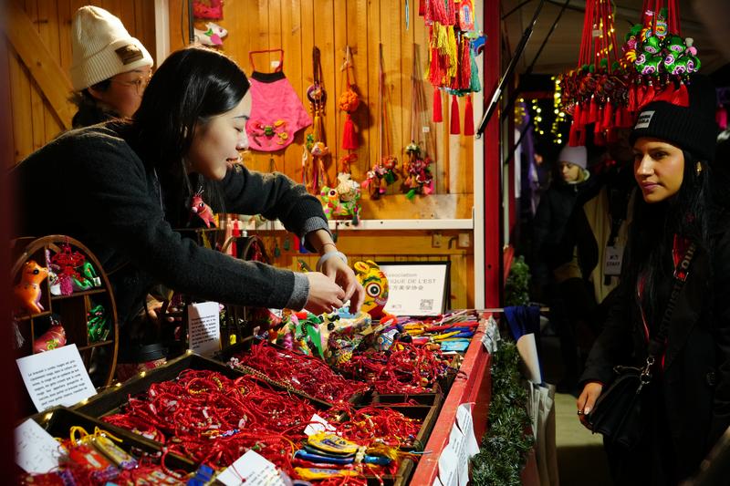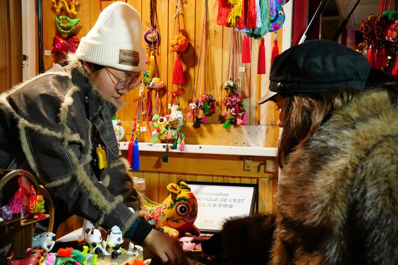 (法國巴黎圣誕集市的慶陽香包展位前,外國友人正在駐足欣賞。)