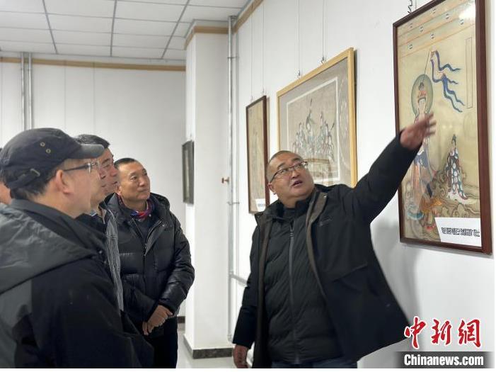 12月17日,由蘭州市七里河區(qū)委宣傳部、七里河區(qū)文體旅局聯(lián)合舉辦的“大漠孤陽映彩霞 敦煌神韻美如畫”新時代文明實踐主題活動暨敦煌巖彩畫書畫藝術(shù)展拉開帷幕。圖為展覽組織者為參觀者講解展出的作品。楊娜 攝