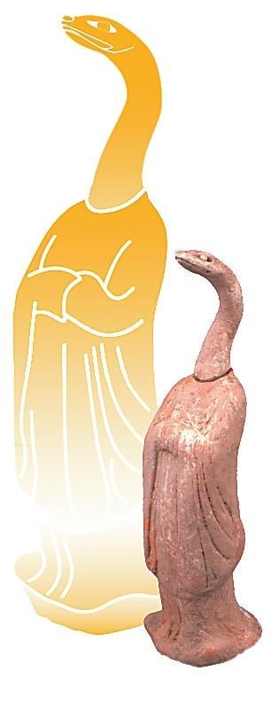 伏羲和女媧是中國神話傳說中的創(chuàng)世神靈,被視為人類文明的始祖。相傳他們均為蛇身人首的形象,象征著自然與人類的和諧統(tǒng)一。伏羲被認(rèn)為是發(fā)明八卦、結(jié)繩記事的智者,開啟了中華文明的智慧之門;而女媧則以其神力摶土造人,煉石補(bǔ)天,維護(hù)了天地的秩序。展覽中展出的高臺(tái)縣博物館館藏的一件魏晉時(shí)期的女媧圖彩繪壁畫磚。畫面繪女媧,人首蛇身,獸足,頭梳高髻,著交領(lǐng)紅裳,右手持月輪,月輪內(nèi)有蟾蜍,左手持規(guī),周圍繪云氣。同時(shí),還展出了一件高臺(tái)縣博物館館藏魏晉時(shí)期的伏羲女媧畫像磚,左側(cè)女媧,一手持矩、一手拿陰物,人首、蛇身、獸足、挽高髻、著交領(lǐng)長衣,腹部繪月輪;右側(cè)伏羲,右手持規(guī),左手持日,內(nèi)有一金烏,周圍云氣環(huán)生,意在天界暢游。兩磚拼合形成陰陽交合圖,為墓葬中室頂部藻井彩繪圖像。畫像中人首蛇身的伏羲、女媧形象,濃縮著中國上古時(shí)代的蛇崇拜意識(shí)。我國古代有天圓地方之稱,伏羲執(zhí)規(guī)象征天,女媧執(zhí)矩象征地,反映了墓主人追隨升天的愿望,也期望其后代能夠繁衍生息。