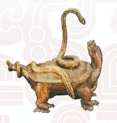 玄武是“四神”中的北方之神?!洞蟠鞫Y》:“龜上彎象天,下平法地。千載神龜,問無不知,廣育無雄,以蛇為雄。故龜與蛇合謂玄武”。因此龜蛇形象的組合亦有陰陽交接之意。除了瓦當(dāng)、畫像磚、雕塑外,古人還常將此二物繪于旗上,用于指揮軍隊(duì)、消災(zāi)避害之用。