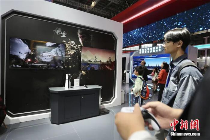 2024年11月5日至10日,第七屆中國國際進(jìn)口博覽會在上海舉辦。圖為11月9日觀眾在中國館體驗游戲《黑神話:悟空》。中新社記者 王紫儒 攝