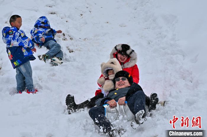 3月2日,云南省迪慶藏族自治州香格里拉市迎降雪天氣,市民自制雪板樂享雪趣。李嘉嫻 攝