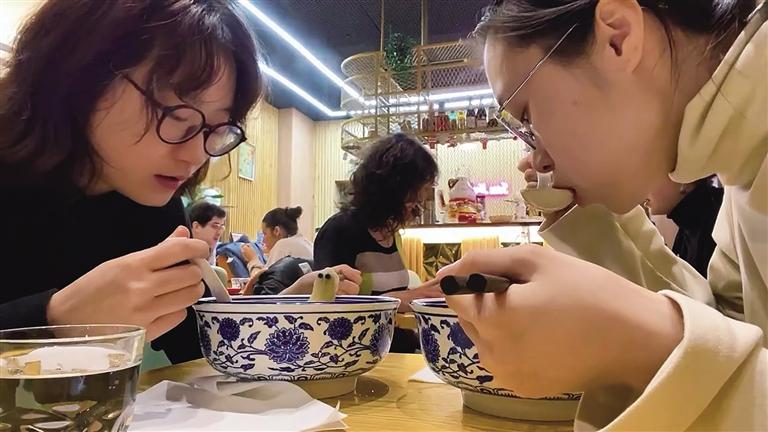 留學(xué)生吳恒芝和朋友品嘗蘭州牛肉拉面