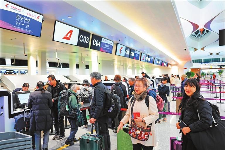 旅客在T3航站樓出港大廳柜臺窗口辦理值機。新甘肅·甘肅日報記者 田蹊