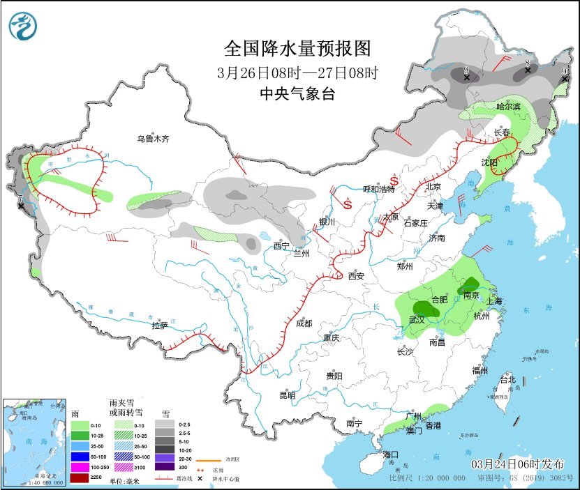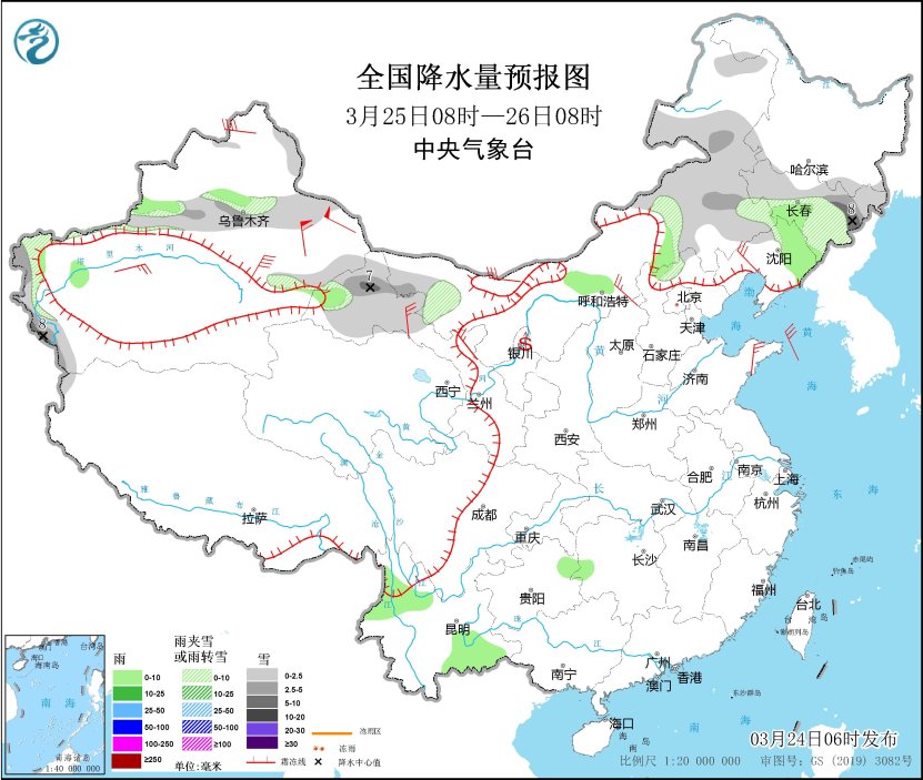 3月25日08時至26日08時,新疆沿天山地區(qū)、內蒙古西北部和東部、吉林大部、甘肅河西等地部分地區(qū)有小到中雪或雨夾雪,其中,吉林東部、新疆南疆西部山區(qū)、甘肅北部等地部分地區(qū)有大雪(5~8毫米)。新疆伊犁河谷、內蒙古中部、吉林中部、遼寧東部、河北北部、湖南西部、貴州東北部、云南西北部和東南部等地部分地區(qū)有小雨。內蒙古中西部、遼寧西部、山東半島、新疆東部、甘肅北部等地部分地區(qū)有4~6級風,新疆山口地區(qū)陣風風力8~9級。內蒙古中西部、甘肅河西、寧夏等地部分地區(qū)有揚沙。