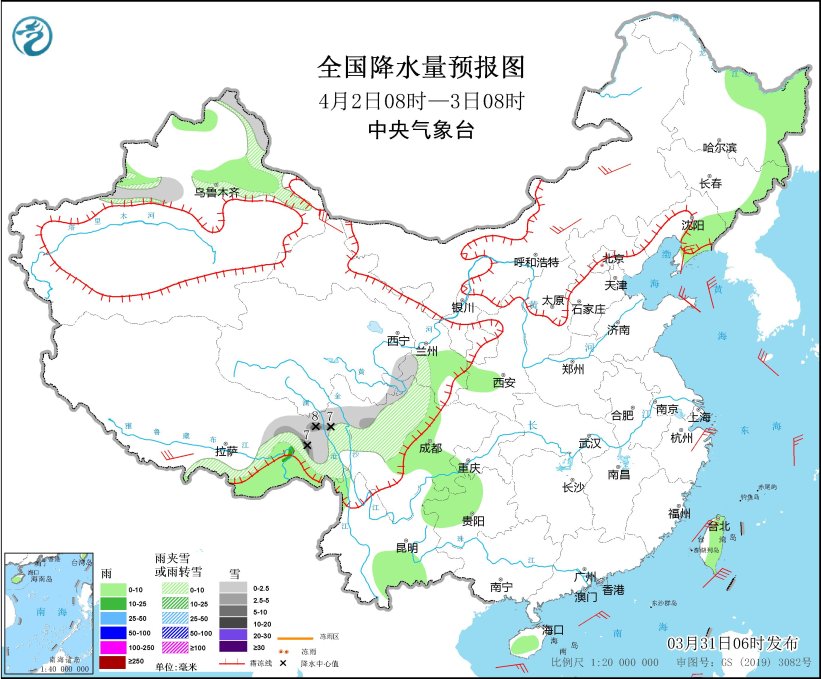 4月1日08時至2日08時,內(nèi)蒙古東部、黑龍江中東部、吉林東部、遼寧東北部、新疆西北部山區(qū)、西藏東部、青海南部、川西高原北部等地部分地區(qū)有小到中雪或雨夾雪,其中,新疆沿天山地區(qū)、西藏東部、川西高原北部等地部分地區(qū)有大雪,局地暴雪(10~16毫米)。新疆伊犁河谷和北疆盆地、西藏東南部、吉林中部、遼寧大部、山東半島、西南地區(qū)東部和南部、海南島東部、臺灣島等地部分地區(qū)有小到中雨,其中,西藏東南部等地局部地區(qū)有大雨(25~40毫米)。西藏南部、內(nèi)蒙古中部、遼寧中南部、河北中南部、天津、山西、山東半島、浙江東部等地部分地區(qū)有4~6級風(fēng),西藏東部部分地區(qū)有6~7級風(fēng);渤海、渤海海峽、黃海西部、東海南部、臺灣海峽、臺灣以東洋面、巴士海峽、南海中北部海域有6~7級風(fēng),陣風(fēng)8級。