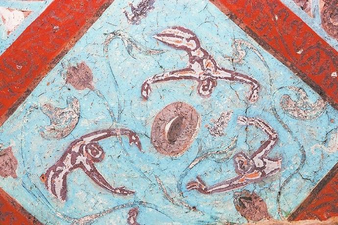 在許多人的認(rèn)知里,飛天是唯美曼妙的化身。在敦煌的許多壁畫中有大量的飛天形象,但是你知道嗎?在這些壁畫中除了凌空飛躍的飛天外,還有不少水中的飛天。在莫高窟第329窟壁畫中有一幅“潛水式飛天圖”:畫面中的一位飛天身著赭紅色長(zhǎng)裙,藍(lán)色飄帶纏身,雙手伸展前伸,似乎正在水中遨游。畫面唯美而靈動(dòng),在曼妙中透著健碩,使人過(guò)目難忘。