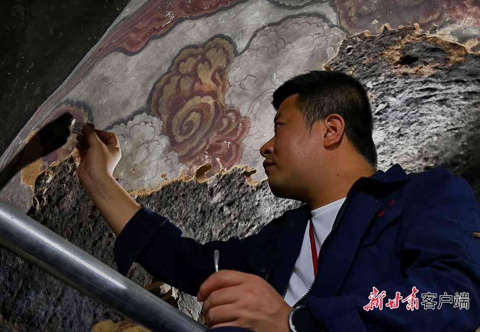 與窟外喧囂不同,在第30窟內,身著工裝的文物修復師緊握刀柄、輕刮泥土,讓壁畫和塑像重現(xiàn)昔日光彩。他們用巧手和匠心,靜靜地觸摸著“光陰的故事”。