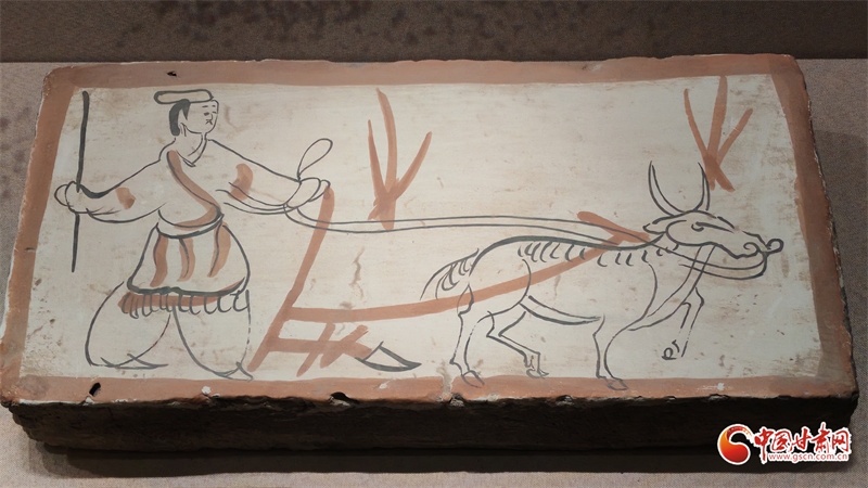 在博物館的“古冢丹青——高臺魏晉十六國時(shí)期墓葬壁畫藝術(shù)陳列”展廳里,記者看到,《二牛耕地畫像磚》生動(dòng)再現(xiàn)了當(dāng)時(shí)的農(nóng)耕技術(shù):兩頭耕牛架著直轅犁,后隨的男子一手扶犁一手揚(yáng)鞭,展現(xiàn)了典型的“二牛抬杠”耕作方式?!赌谅箞D壁畫磚》則描繪了古人放牧鹿群的獨(dú)特場景,為研究當(dāng)時(shí)的畜牧業(yè)發(fā)展提供了珍貴資料。