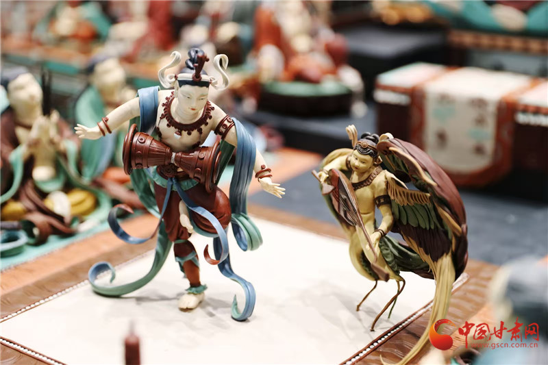 今年蘭洽會(huì)甘肅非遺館,正中央的敦煌文化題材《觀無(wú)量壽經(jīng)變》面塑受到客商全員追捧。經(jīng)過(guò)這里的人都會(huì)駐足欣賞,感受面塑藝術(shù)的精彩絕倫,其中,敦煌題材的面塑,飛天人物似乎從壁畫(huà)里飛了出來(lái),栩栩如生。