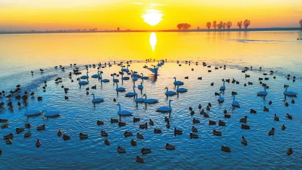 11月20日,甘肅金塔縣芨芨水庫(kù)濕地,遷徙越冬的白天鵝、赤麻鴨成群翔集湖面,成為初冬一道靚麗風(fēng)景。近年來,金塔縣持續(xù)改善生態(tài)環(huán)境,加強(qiáng)濕地保護(hù)與修復(fù)工作,為水鳥提供了理想的棲息場(chǎng)所,每年在此棲息的候鳥多達(dá)數(shù)萬只。 奔流新聞·蘭州晨報(bào)通訊員 曹紅祖 李鵬 段金龍 攝