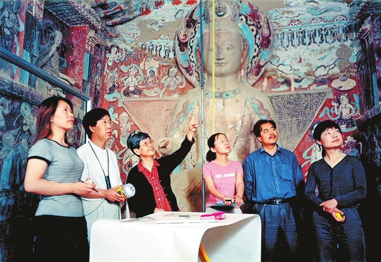 樊錦詩帶領(lǐng)項(xiàng)目團(tuán)隊(duì)在莫高窟第275窟核對(duì)石窟考古報(bào)告測繪圖。
