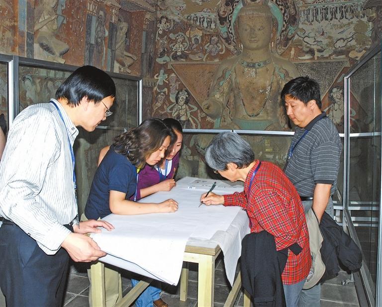 2007年,為石窟考古報(bào)告評(píng)議手工測繪圖。 本版圖片除署名外均由敦煌研究院提供