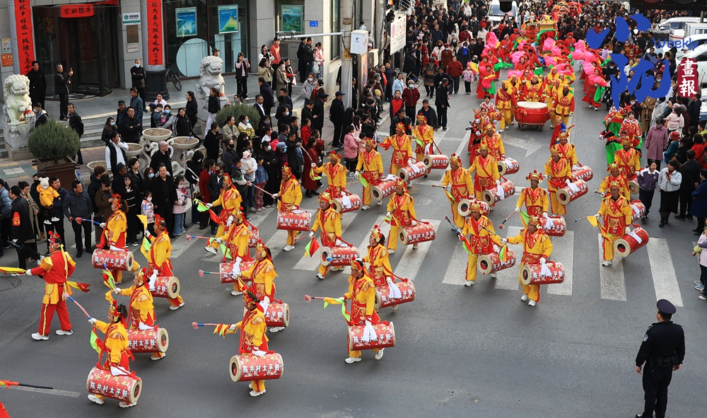 太平鼓隊(duì)的指揮者豹頭環(huán)眼,胸前“帥”字披紅,手中兩米長(zhǎng)的令旗迎風(fēng)一展——百十面太平鼓瞬間炸響如雷。只見(jiàn)他騰挪跳躍,旗尖所指,鼓點(diǎn)隨之起伏,時(shí)而如萬(wàn)馬奔騰,時(shí)而似春雨潤(rùn)物。